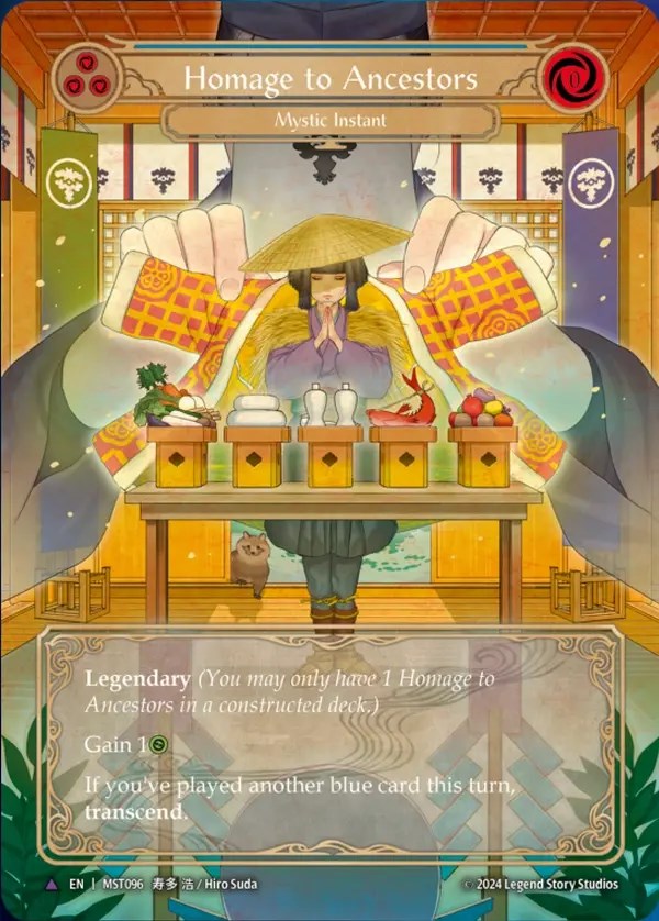 Legendary (You may only have 1 Homage to Ancestors in a constructed deck. Gain 1 [LIFE] If you've played another blue card this turn, transcend. Inner Chi ([Chi] can pay for [Chi] or [Resource] costs.) (Transcended from Homage to Ancestors.)
